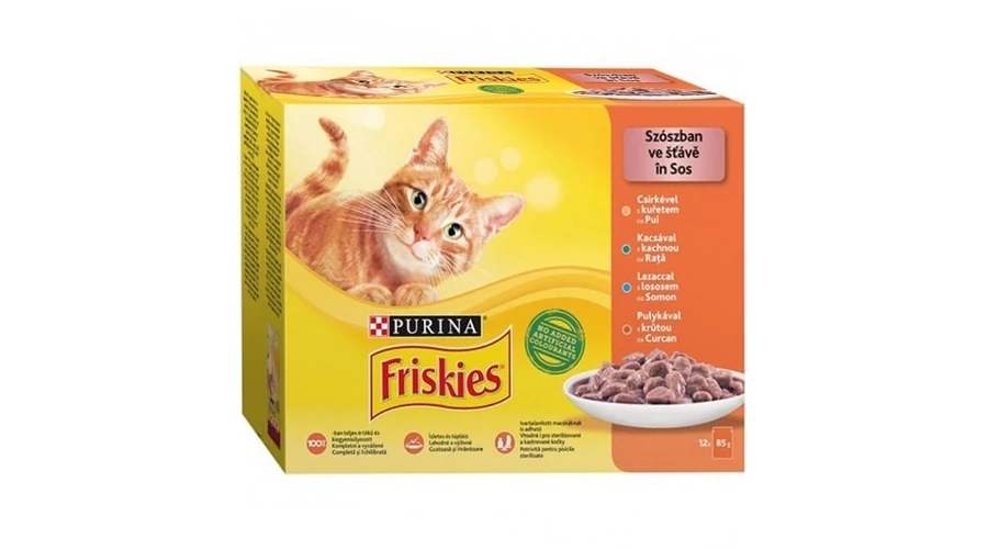 Állateledel Purina Friskie macskáknak. Ízesítés: csirke-kacsa-lazac.pulyka válogatás. Kiszerelés: 12 x 85 gramm / alutasak / doboz.
