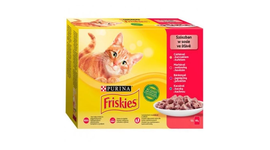 Állateledel Purina Friskie macskáknak. Ízesítés: csirke-marha-bárány-kacsa válogatás. Kiszerelés: 12 x 85 gramm / alutasak / doboz.
