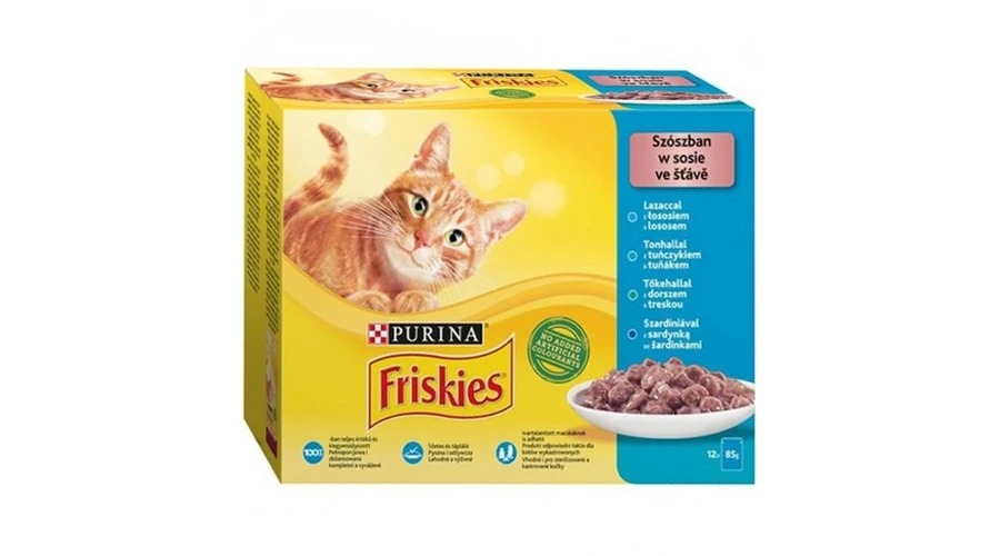 Állateledel Purina Friskie macskáknak. Ízesítés: lazac-tonhal-tőkehal-szardínia válogatás. Kiszerelés: 12 x 85 gramm / alutasak / doboz.