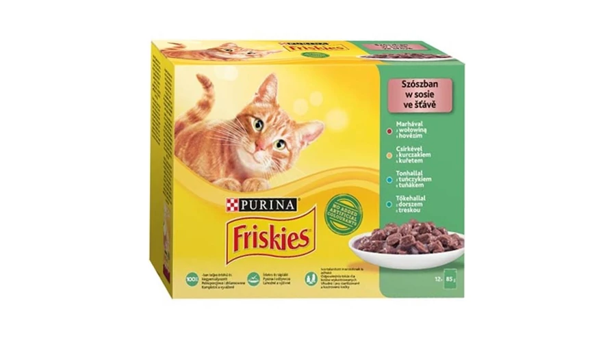 Állateledel Purina Friskie macskáknak. Ízesítés: marha-csirke-tonhal-tőkehal válogatás. Kiszerelés: 12 x 85 gramm / alutasak / doboz.