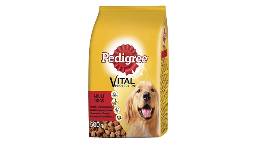 Pedigree Kutyaeledel. Kiszerelés: 500 gramm / csomag. Teljes értékű állateledel adult kutyák számára. Etetési útmutató a csomagoláson.