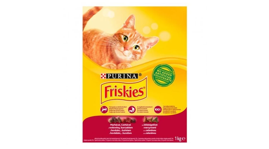 Állateledel száraz Friskies macskáknak. Ízesítés: marhával, csirkével és zöldséggel ízesítve. Kiszerelés: 1 kg / zacskó.