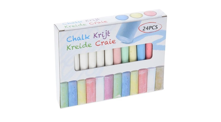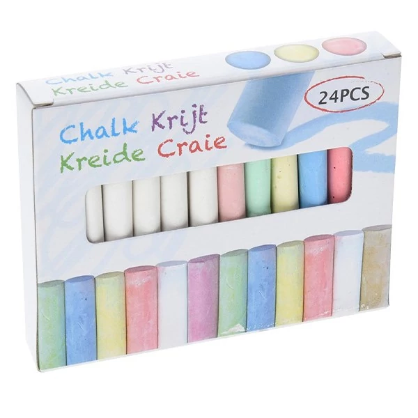 Vastag aszfaltkréta, fehér és veges színek egy dobozban. A készlet tartalma: 24 darab.