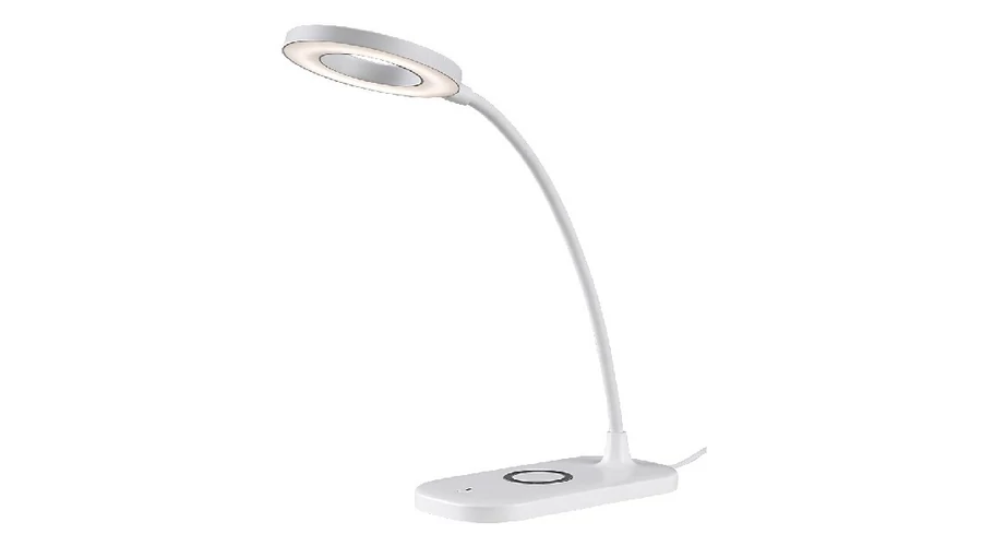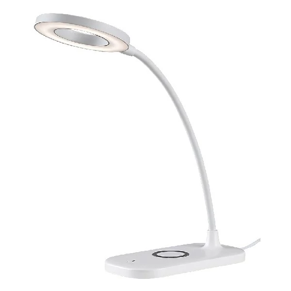 A modern Hardin asztali lámpa számos extra funkciójával nélkülözhetetlen társa lesz a dolgozószobában vagy bármely íróasztalnál. A teljes egészében műanyag okos lámpa fehér színben fehér búrával készül, a lámpafej fánk formájú, a téglalap alakú dísztalp lekerekített sarkakat kapott. A Hardin a G energiaosztályba tartozó beépített LED fényforrással rendelkezik, amelynek a teljesítménye 5 W, fényereje búrával 210 lumen, búra nélkül 720 lumen, élettartama pedig 20 000 óra. A lámpa színhőmérséklete 2700–6000 K között változtatható, azaz beállíthatunk meleg, természetes vagy hideg fehér fényt. Utóbbi különösen alkalmas munkavégzéshez, tanuláshoz. Ezenkívül a lámpa dimmelhető, azaz fényereje is változtatható. A színhőmérséklet és a fényerő a talpon elhelyezett érintőkapcsoló segítségével állítható. A Hardin vezeték nélküli töltővel rendelkezik, valamint USB-kábel segítségével tölthető. Az asztali lámpa méretei a következők: magassága 290 mm, átmérője 100 mm, beépítési mélysége 165 mm.