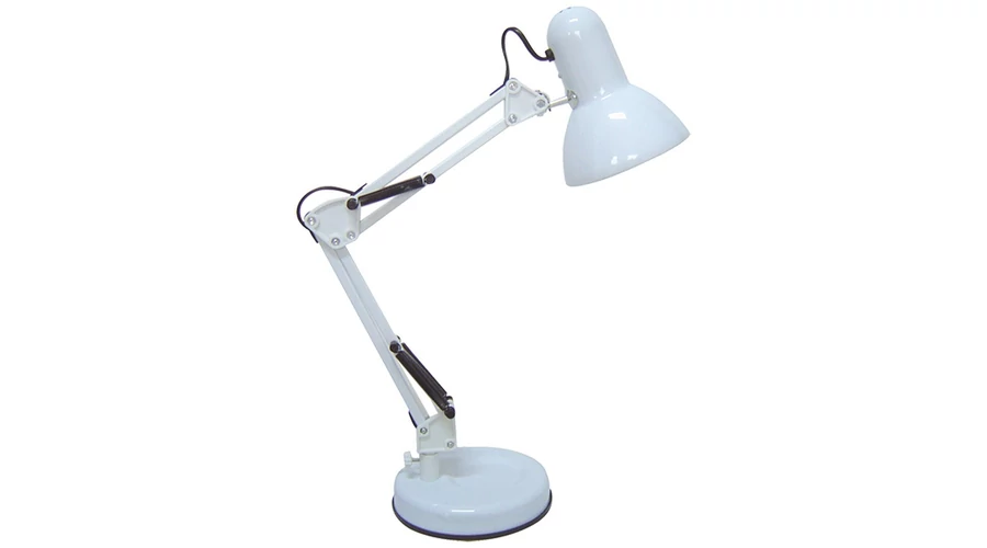 Megfelelő asztali megvilágítást biztosító asztali lámpa állítható karral és fejjel, 49 cm-es magassággal, fehér színben. Fém alapanyag, tartós kivitel, IP20-as védettség. A lámpatest E27-es foglalatú, maximum 60W teljesítményű halogén vagy energiatakarékos fényforrással használható.