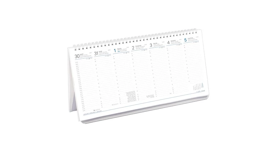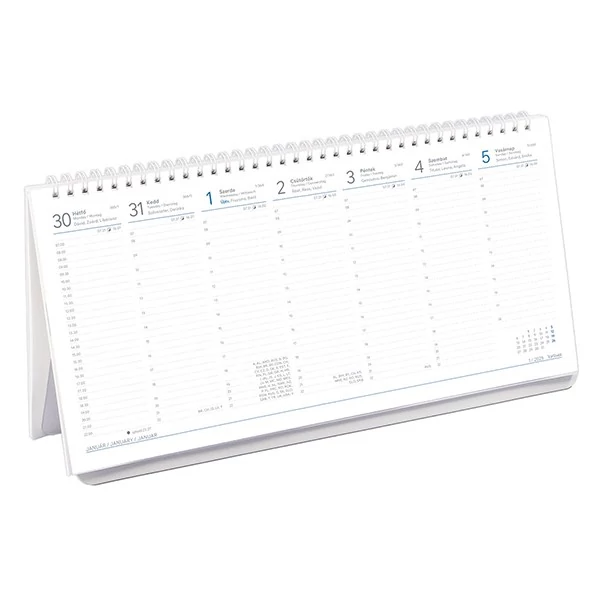 Papírtáblával készült, fehér tömbös, álló, kétoldalas asztali naptár. Szitázással emblémázható.