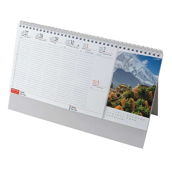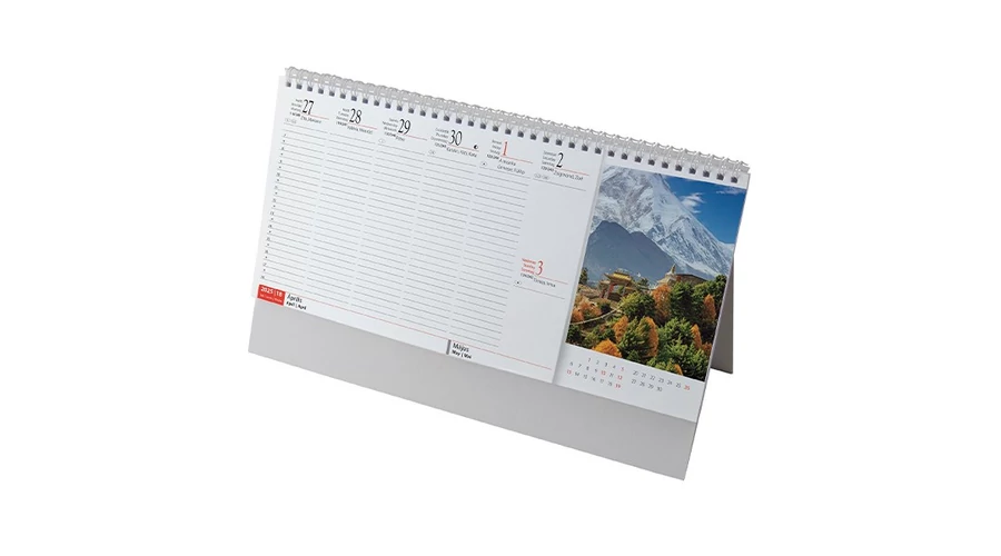 Ikerspirállal összetűzött naptár heti beosztással, 12 színes képpel, papírtáblás, álló asztali naptár. Naptárbeosztás: heti. Reklámfelület: 320x40 mm