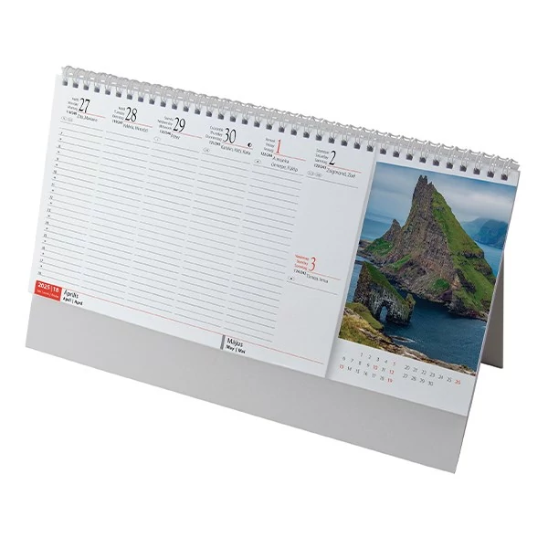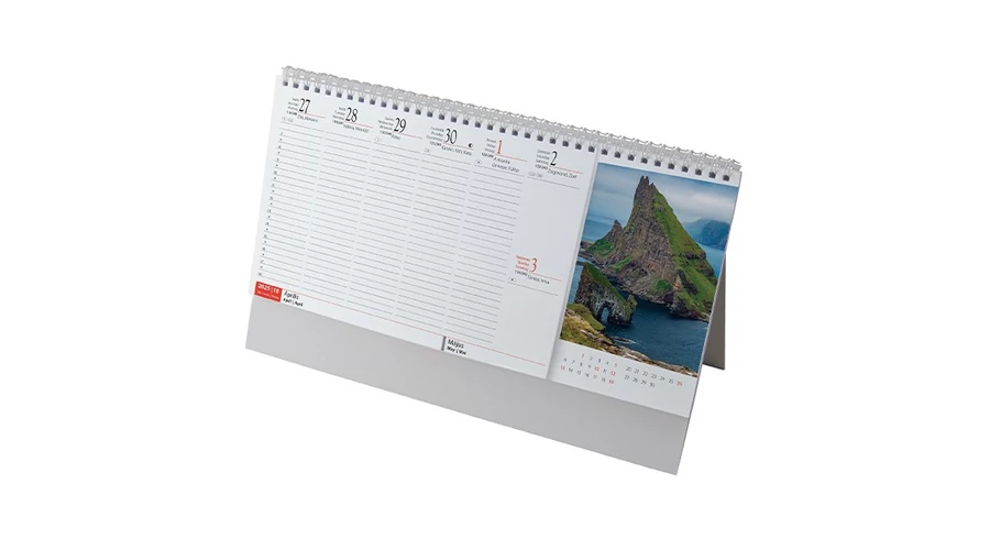 Ikerspirállal összetűzött naptár heti beosztással, 12 színes képpel, papírtáblás, álló asztali naptár. Naptárbeosztás: heti. Reklámfelület: 320x40 mm