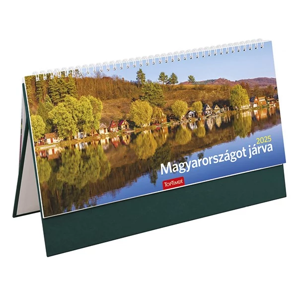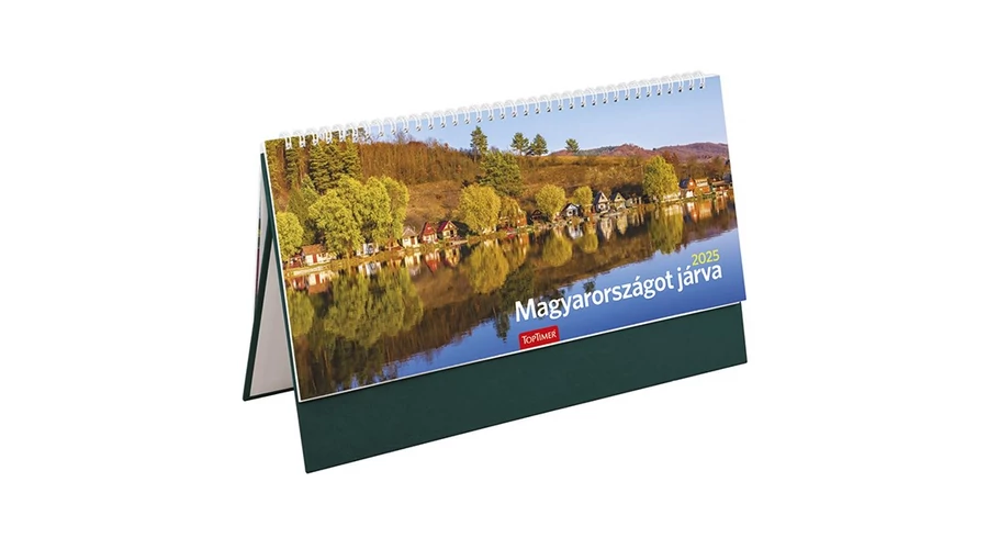 Műbőrtáblával készült, álló, fehér tömbös, képes asztali naptár.