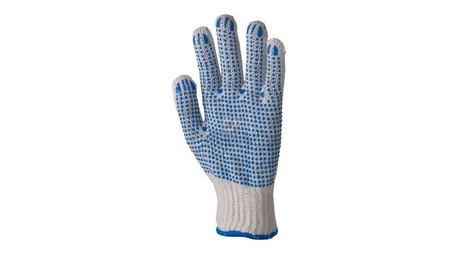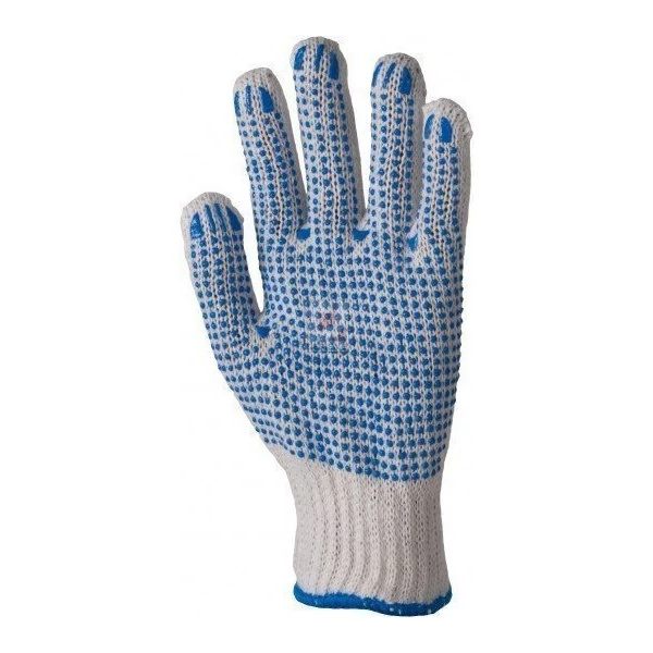 Kötött pamut/poliészter kesztyű, tenyér és ujjrészen kék PVC pöttyökkel, gumírozott mandzsettával.