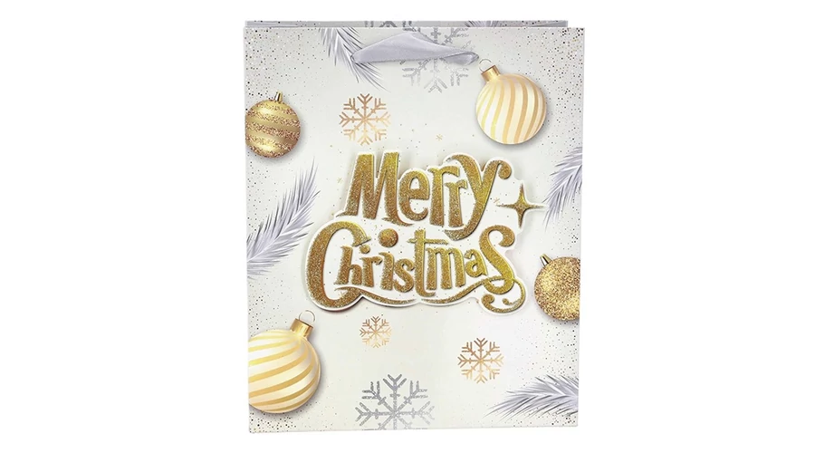 Dísztasak CREATIVE Simple S 23,5x19,5x8 cm karácsonyi feliratos 3D glitteres szalagfüles