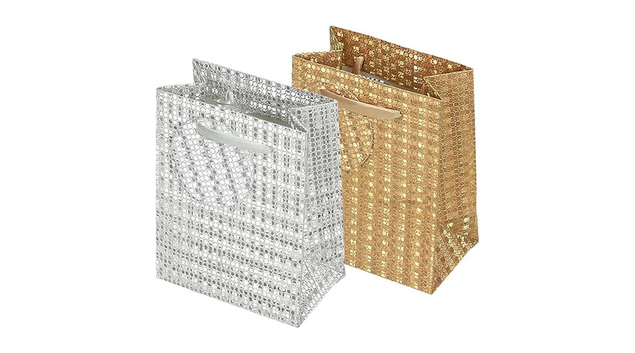 Ajándéktasak, fényes, glitteres, arany és ezüst színben, S 11 x 14 x 6,5 cm méretben, szalagfüles. Vegyes színekben, a színválasztás nem lehetséges.
