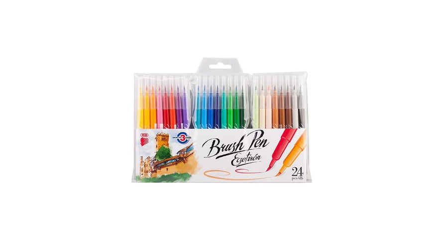 Ecset jellegű, hajlékony írócsúccsal ellátott rostirón, rajzolásra, nagyobb felületek színezésére. 24 féle élénk színben.