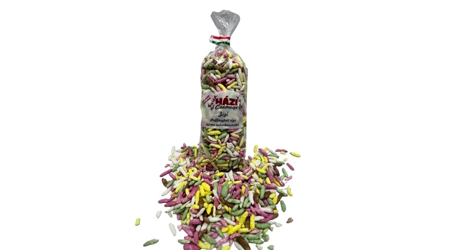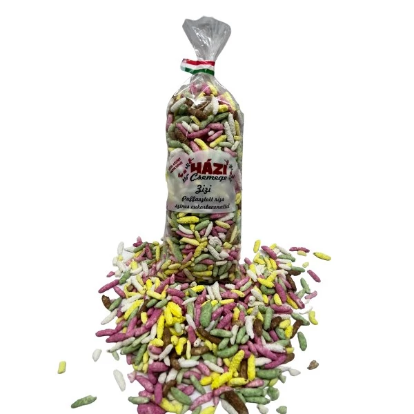 cukor (56%), puffasztott rizs, kakaópor, étkezési sav:citromsav, aromák, színezékek:kurkumin, kárminok, klorofillinek