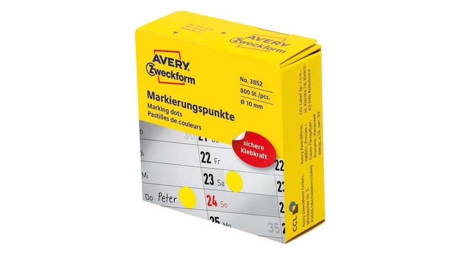 Etikett AVERY 3852 öntapadó jelölőpont adagoló dobozban sárga 10mm 800 jelölőpont/doboz