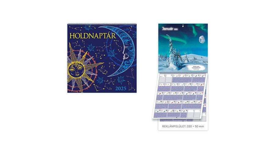 Magyar naptárháló, 14 lapos, 330 × 330 mm-es lapok. A Holdnaptár mindennapi tevékenységeinkhez szolgál hasznos útmutatóval.