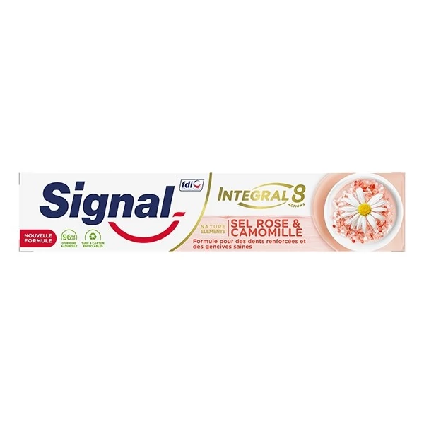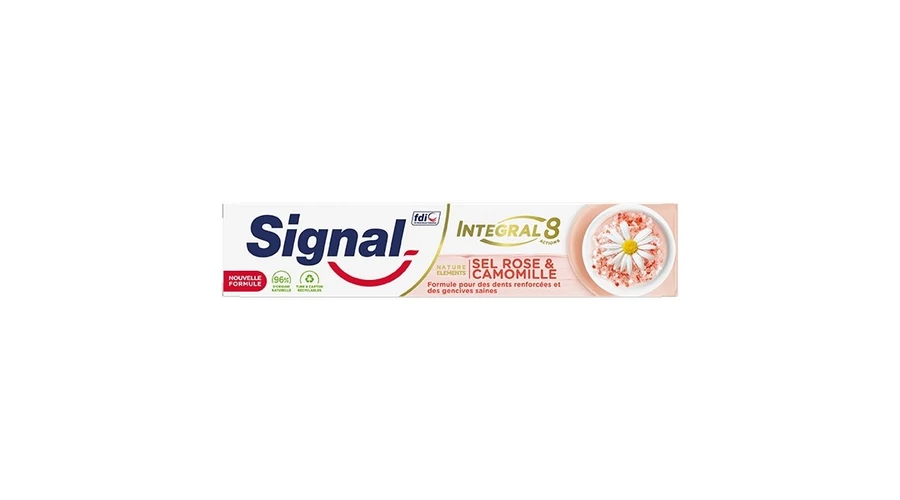 A Signal Nature Elements Salt & Chamomile fogkrém 100%-ban természetes rózsaszín sót és kamillaolajat tartalmaz, mely segít megelőzni a fogkőképződést, védelmet nyújtani a fogszuvasodás ellen és gátolni a lepedékképződést. A 96%-ban természetes eredetű összetevőkkel megalkotott Nature Elements fogkrémünk formulája természetes eredetű ásványi cinket tartalmaz, melynek köszönhetően antibakteriális hatású. Klinikailag bizonyított technológia.