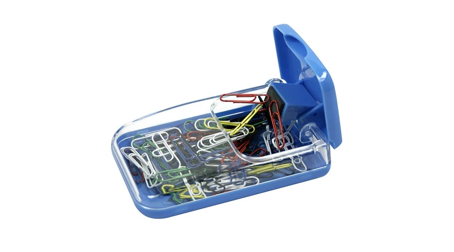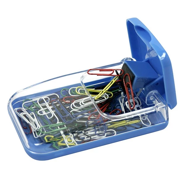 Átlátszó műanyag testű gemkapocstartó mágneses fedéllel.