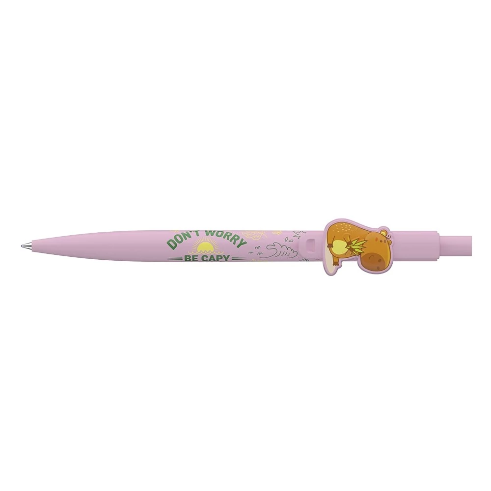 Nyomógombos mechanikával működő golyóstoll, capybara formájú klipsszel. Cserélhető X-20-as kék színű golyósbetéttel. Írásvonalvastagság: 0,8 mm.
