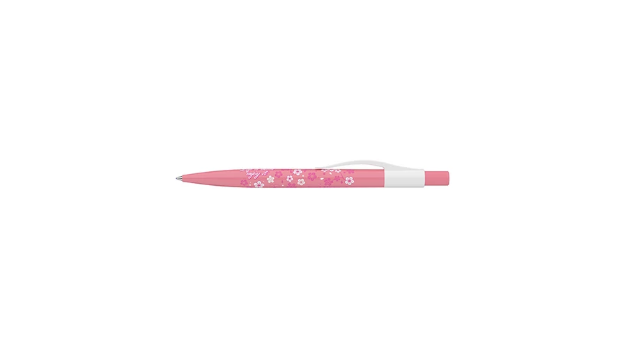 Cseresznyevirág motívummal díszített nyomógombos mechanikával működő golyóstoll 0,8 mm-es kék színű golyósbetéttel.