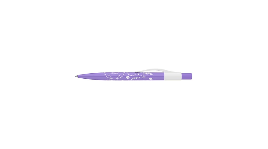 Levendula motívummal díszített nyomógombos mechanikával működő golyóstoll 0,8 mm-es kék színű golyósbetéttel.