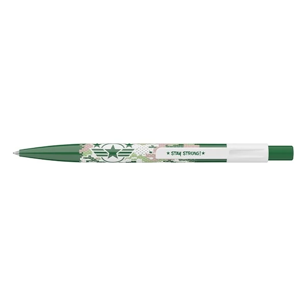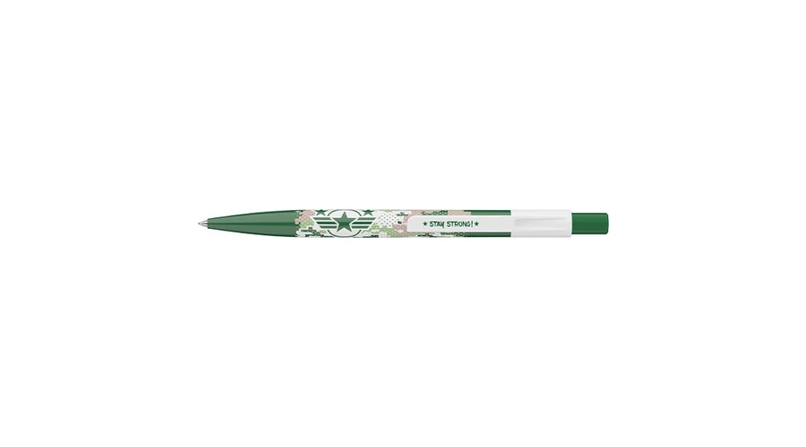 Katonai motívummal díszített nyomógombos mechanikával működő golyóstoll 0,8 mm-es kék színű golyósbetéttel.