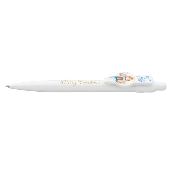 Nyomógombos mechanikával működő golyóstoll, amelyen karácsonyi elemek díszítik a tolltestet és Angyalka nyomat a klipszet. Cserélhető X-20-as kék színű golyósbetéttel. Írásvonalvastagság: 0,8 mm.