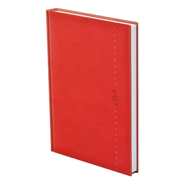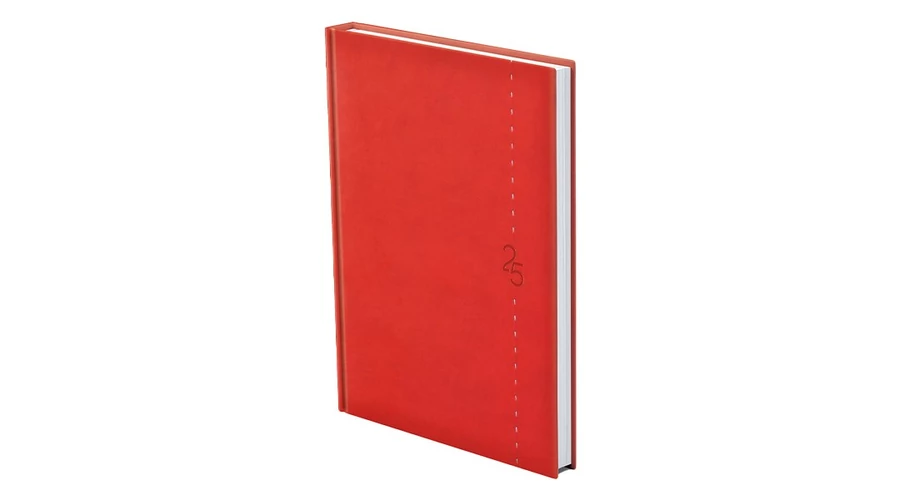 Matt, bőrhatású, hőre színeződő műbőr bevonóval, függőleges dísztűzéssel készült, fehér tömbös naptár, jelzőszalaggal és sarokperforációval (kivéve zsebnaptár). Vaknyomással és lézergravírozással emblémázható.