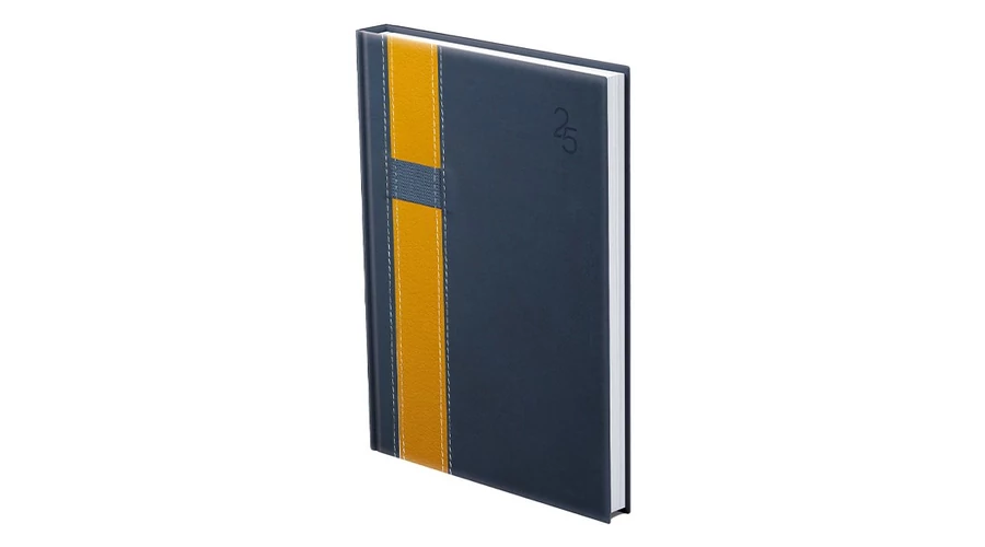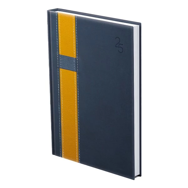 Kétféle, matt, bőrhatású és eltérő felületű, hőre színeződő műbőr bevonóval, varrással díszitett, gumis tolltartóval ellátott, fehér tömbös heti naptár, jelzőszalaggal és sarokperforációval. Vaknyomással és lézergravírozással emblémázható.