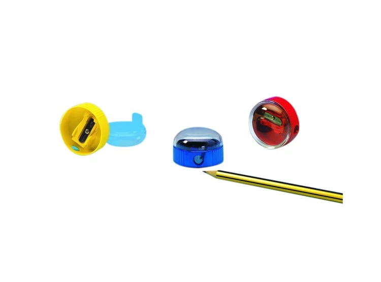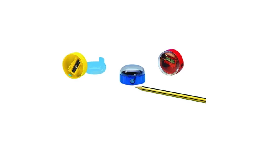 Áttetsző, színes műanyagból készült 1 lyukú hegyező, 8 mm-es ceruzákhoz, forgácsgyűjtő tartállyal. Méret: 4,5 x 3 cm.