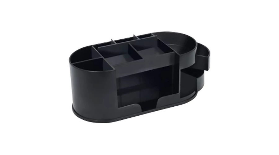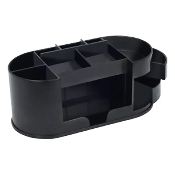Műanyag, több rekeszes kialakítású, ovális alakú, töltetlen írószertartó.