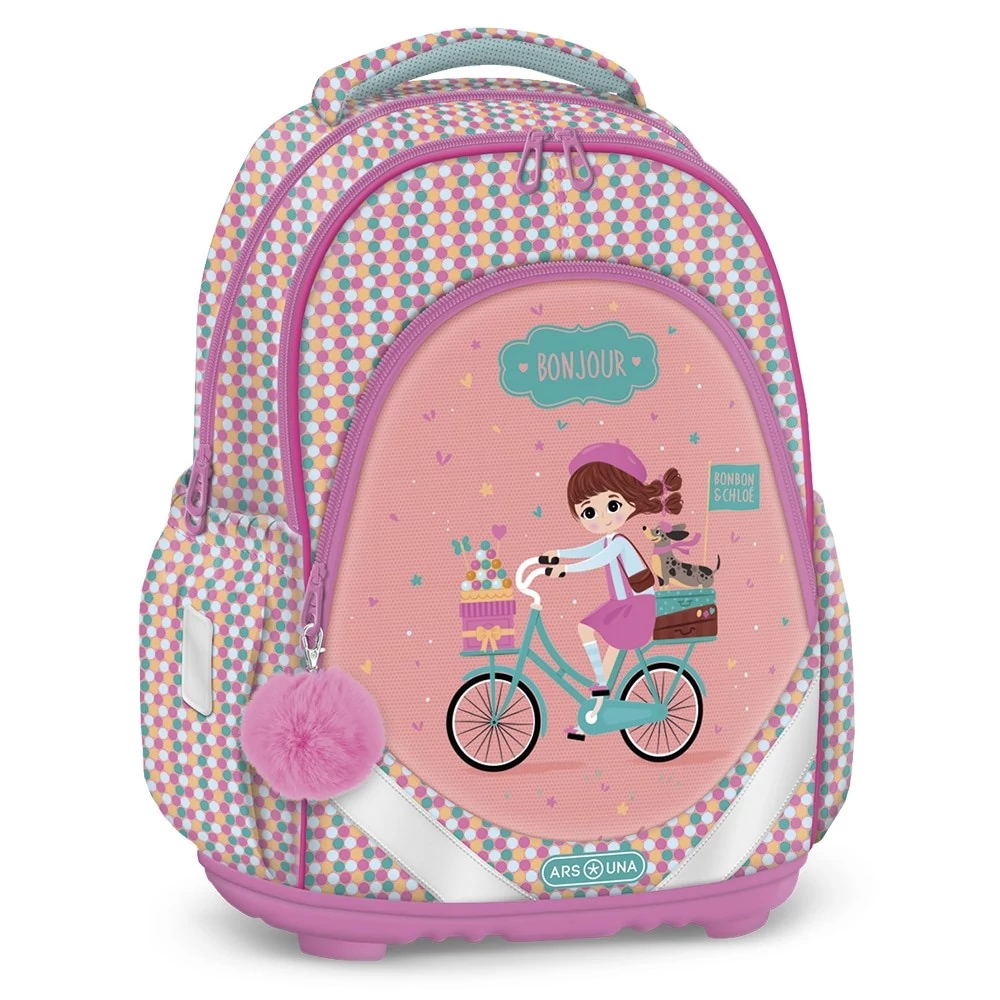 Hátizsák formájú iskolatáska, amely ideális kisiskolásoknak. Ergonómikus kialakítású, szellőztető barázdákkal teli és műanyag merevítésű hátkiképzéssel. Puha, méretre állítható vállpántokkal, amelyekekkel szabályozható, hogy mennyire álljon feszesen a gyerek hátához simulva a táska. A hátizsák három nagy cipzáras rekesszel rendelkezik,az elsőben toll- és igazolvány tartó rekesz található. Oldalán két gumis zsebbel a kulacs részére. Alja tartós és kemény textillel bevont műanyag. Nagy felületű fényvisszaverő elemekkel elől, oldalt és a vállpántokon. Tetején fogantyúval. Ajándék pompom a táskához. Mérete: 330x430x220 mm. Súlya: 0,9 kg. Táska űrtartalma: 23 l. Terhelhetőség: 10 kg-ig. 3 év garancia.