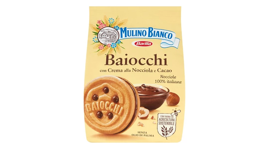 A Mulino Bianco Baiocchi keksz egy finom olasz sütemény, amely két ropogós omlós kekszből áll, középen pedig gazdag mogyorós-kakaós krémmel van megtöltve. Ez a krém lágy, édes ízvilágával tökéletes párosítást nyújt a keksz ropogós textúrájával, így ideális snack lehet a nap bármely szakaszában.