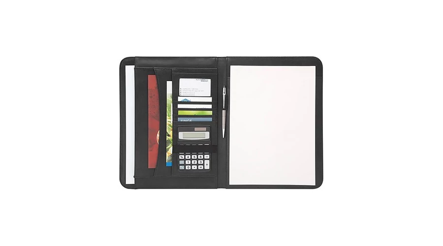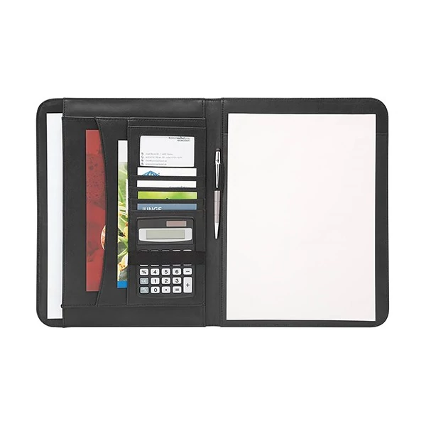 A/4-es műbőr konferencia mappa, jegyzettömbbel, A/4-es és A/5-ös zsebbel. Átlátszó zseb a névjegykártyának, gumis írószertartóval. Mérete: 25x2,5x33