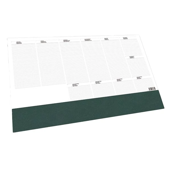 Fehér tömbös, 26 letéphető lapot tartalmazó asztali könyöklő. Szitázással, présfólia- és vaknyomással emblémázható. Naptárbeosztása: heti.