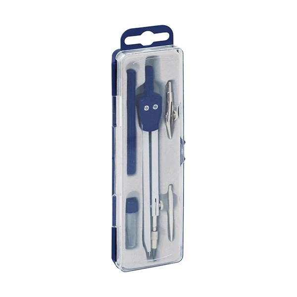 Fémből készült, hagyományos iskolai körző 4 kiegészítővel egy műanyag dobozban.