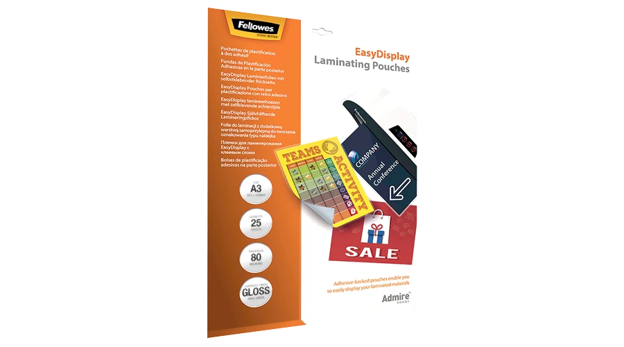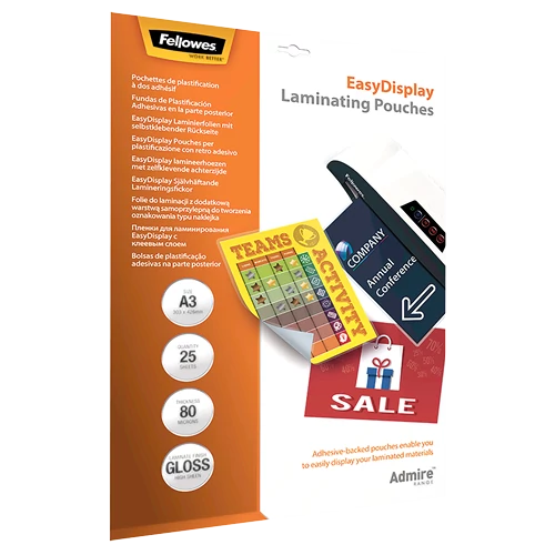 Lamináló fólia FELLOWES A/3 Admire Easy Display 80 mikron fényes öntapadó 25 db/csomag