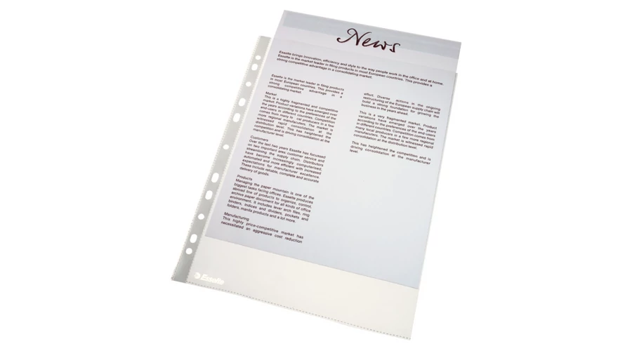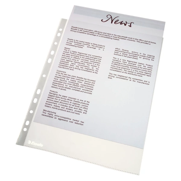 Minőségi tasak mindennapos használatra. Az univerzális lyukasztású lefűzőcsíknak köszönhetően kényelmes tárolási megoldást biztosít dokumentumok számára bármilyen iratrendezőben, gyűrűskönyvben. Narancsos felületű, 43 mikron vastag, újrahasznosítható PP alapanyag. Felül nyitott, melynek köszönhetően a dokumentumok könnyen kiemelhetők a tasakból akár magában az iratrendezőben is. A 11 lefűzőlyuknak köszönhetően bármilyen iratrendezőben, gyűrűskönyvben használható. A4 mérethez.