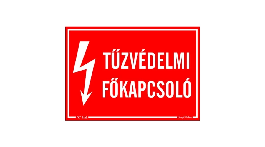 Tűzvédelmi főkapcsoló matrica. Mérete:14x5 cm piros alapon fehér betűvel.