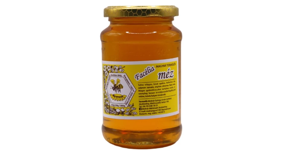 Facélia (Mézontófű) méz. Hatása: jó fertőtlenítő, bőrápoló hatású, kiválóan gyógyítja az égett bőrt. Jelentősen befolyásolja a vér koleszterin szintjét. Kiszerelés: 500g/üveg.