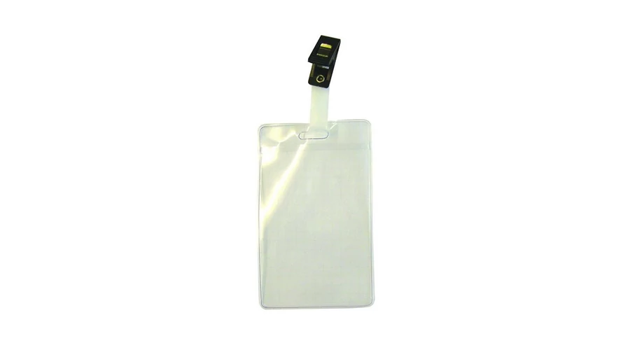 Átlátszó, lágy műanyagból készült álló formátumú névjegykitűző csiptetővel. Méret: 65 x 105 mm.