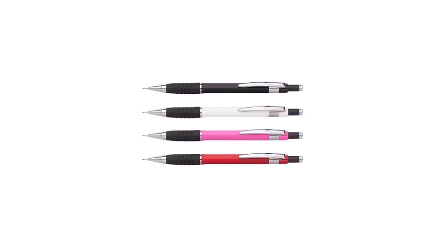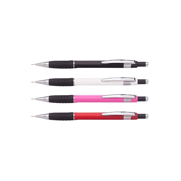 Mechanikus ceruza, 0,5 mm-es, a nyomógomb elforgatásával adagolható beépített radír, fém klipsz. Vidám, élénk színekben.