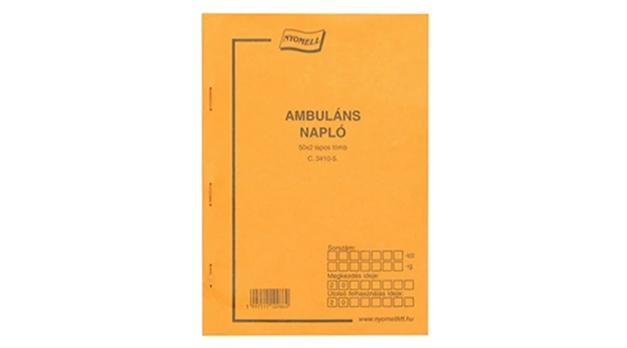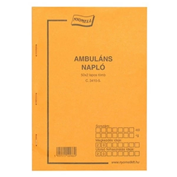 Ambuláns napló. A/5 méretű, álló, 50 lapos, 2 példányos. Minőségi belív, karton fedlap. Kiszerelés: 20 db/csomag.