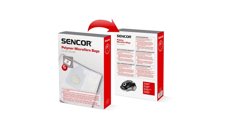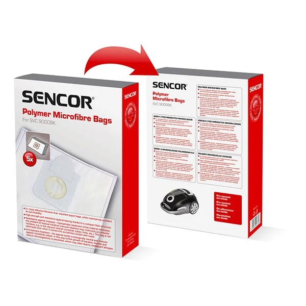 Polimer mikroszálas, egyszerhasználatos porzsák a SVC 9000BK/SVC 9050BL porszívóba 4 literes térfogat Retesz a porzsák pormentes és higiénikus kidobásához A csomagolás tartalma 5 zacskó Előnyök a hagyományos papírzsákokkal szemben: - 2-szer hatékonyabb szűrés, kiváló levegő-áteresztési tulajdonságokkal - A kompakt szálstruktúrának köszönhetően tartós és szakadásálló - Jobban igazodik a szívókamra falához, és segíti a levegő hatékony áramlását - A porszívózás hatékonysága folyamatos, a porzsák a teljes feltöltődésig használható - 50 %-kal hosszabb élettartam - EPA szűrőknek megfelelő szűrési hatékonyság Nedvességálló – az anyag hidrofób kivitele megbirkózik a visszamaradt nedvességgel (porszívókban gyakran halmozódik fel nedvesség, pl. a szívócsövekben, tömlőkben, porgyűjtő kamrában stb.) A nedvesség nem teszi tönkre a zsákot (pl. víz véletlen felszívása miatt). Antibakteriális kivitel – a speciális szövet biológiailag semleges, a mikrobák nem szaporodnak el a zsákban. Meggátolja a baktériumok, penészgombák, és más mikroorganizmusok szaporodását, amelyek gyakran okoznak allergiát az érzékeny egyéneknél