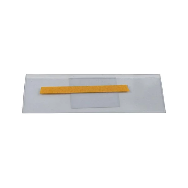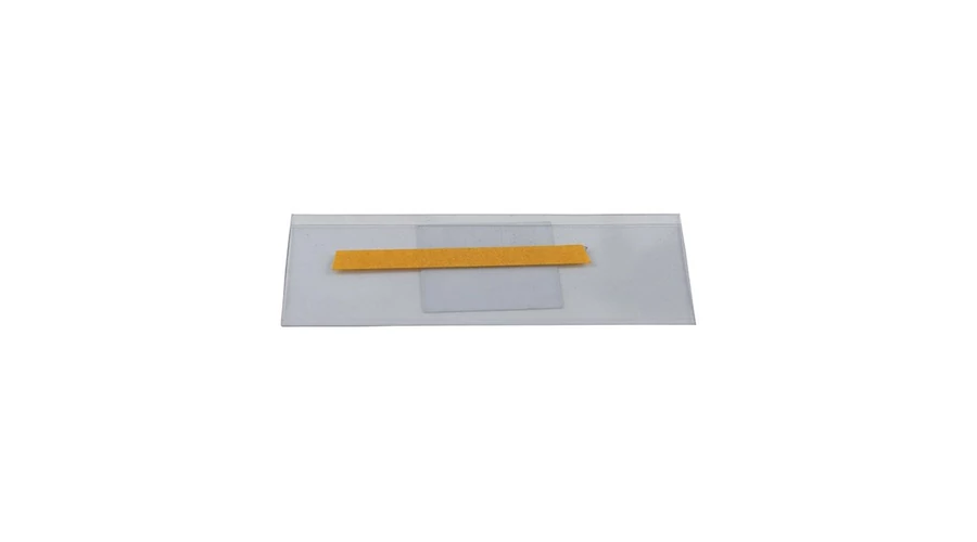 Víztiszta (teljesen átlátszó) 0,5 mm-es műanyag, amibe egy 8,2 x 4,3 cm méretű papírt lehet a dupla részébe belecsúsztatni.