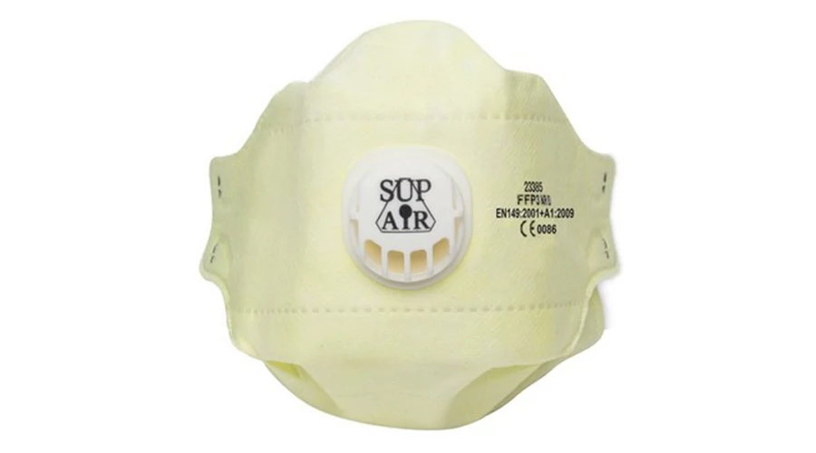 • FFP3 eldobható 3D összecsukható félálarc polipropilénből elektrosztatikus szűrőanyaggal és kilégzőszeleppel, latexmentes szintetikus gumival, PU hab orrpárnával.