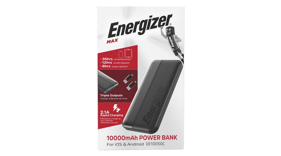 A 10 000 mAh-s nagy kapacitás extra képernyőidőt biztosít akár 36 óráig okostelefonok, 12 óráig kicsi táblagépek és 8 óráig nagy táblagépek esetében.