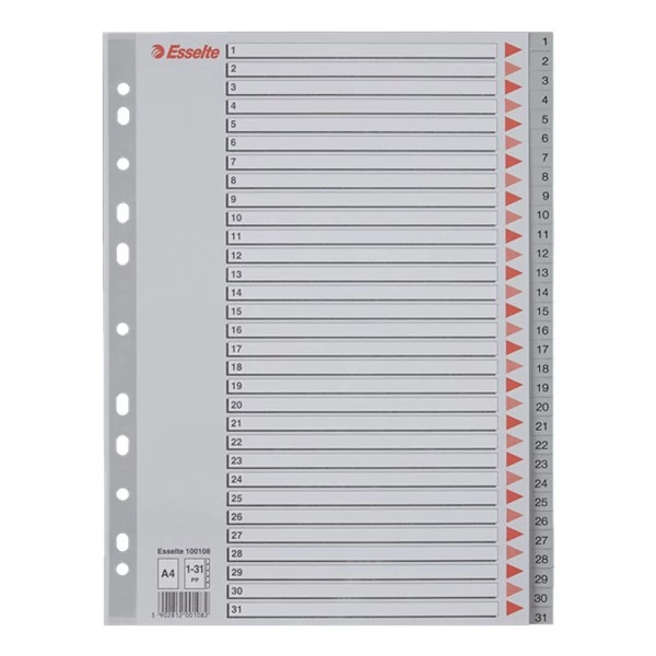 Szürke színű regiszter. Nagyméretű téglalapok az előlapon a tartalom feltüntetésére. Megerősített lefűzőrész az előlapon. 1-31 felirattal rendelkező regiszter fülek a dokumentumok gyors eléréséhez. Hagyományos, 11-lyukú lefűzőrész. A4 méret. 0,12 mm vastag PP alapanyag.
