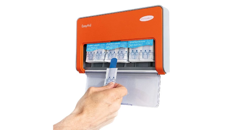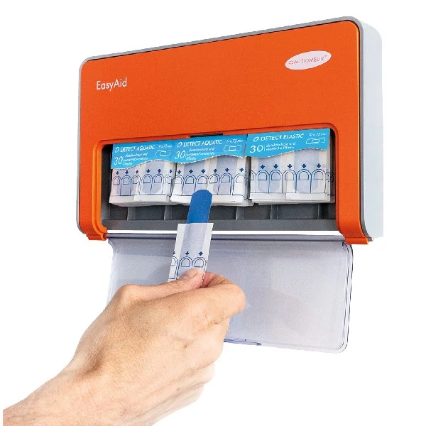 Egykezes sebtapasz adagoló, melyben akár háromféle sebtapasz is elfér. Az újratöltés szükségét az intelligens Kanban rendszer jelzi. Higiénikus kivétel a lefelé nyíló nyíláson keresztül. Opcionálisan lopás ellen zárható. A zárt ház még kihívásokkal teli környezetben is védi a tartalmat az elkoszolódástól. Könnyen felismerhető a narancssárga jelzőszín miatt. Felszerelési anyagot és használati utasítást is tartalmaz. 2x 30 db DETECT AQUATIC, és 1x 30 db DETECT ELASTIC sebtapasszal. Sebtapaszok mérete: 19 x 72 mm.