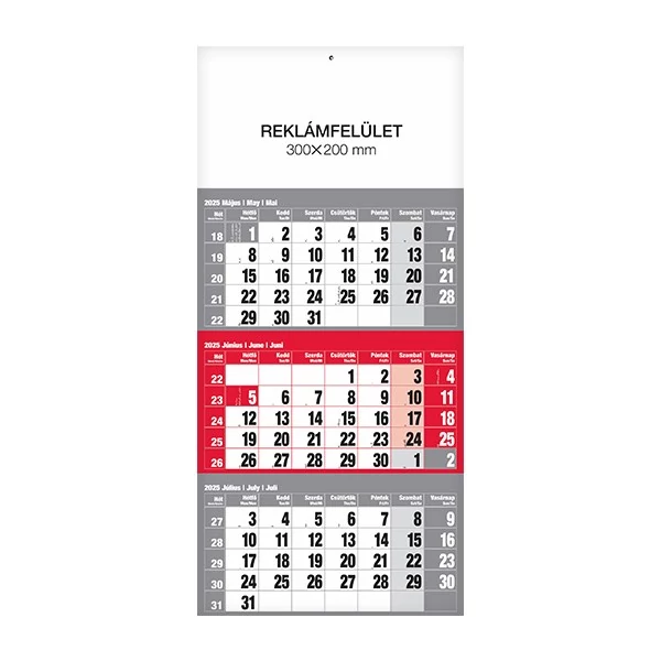 1 tömbből álló 3 havi speditőr falinaptár piros fejlappal. Naptár teljes mérete: 300 x 680 mm